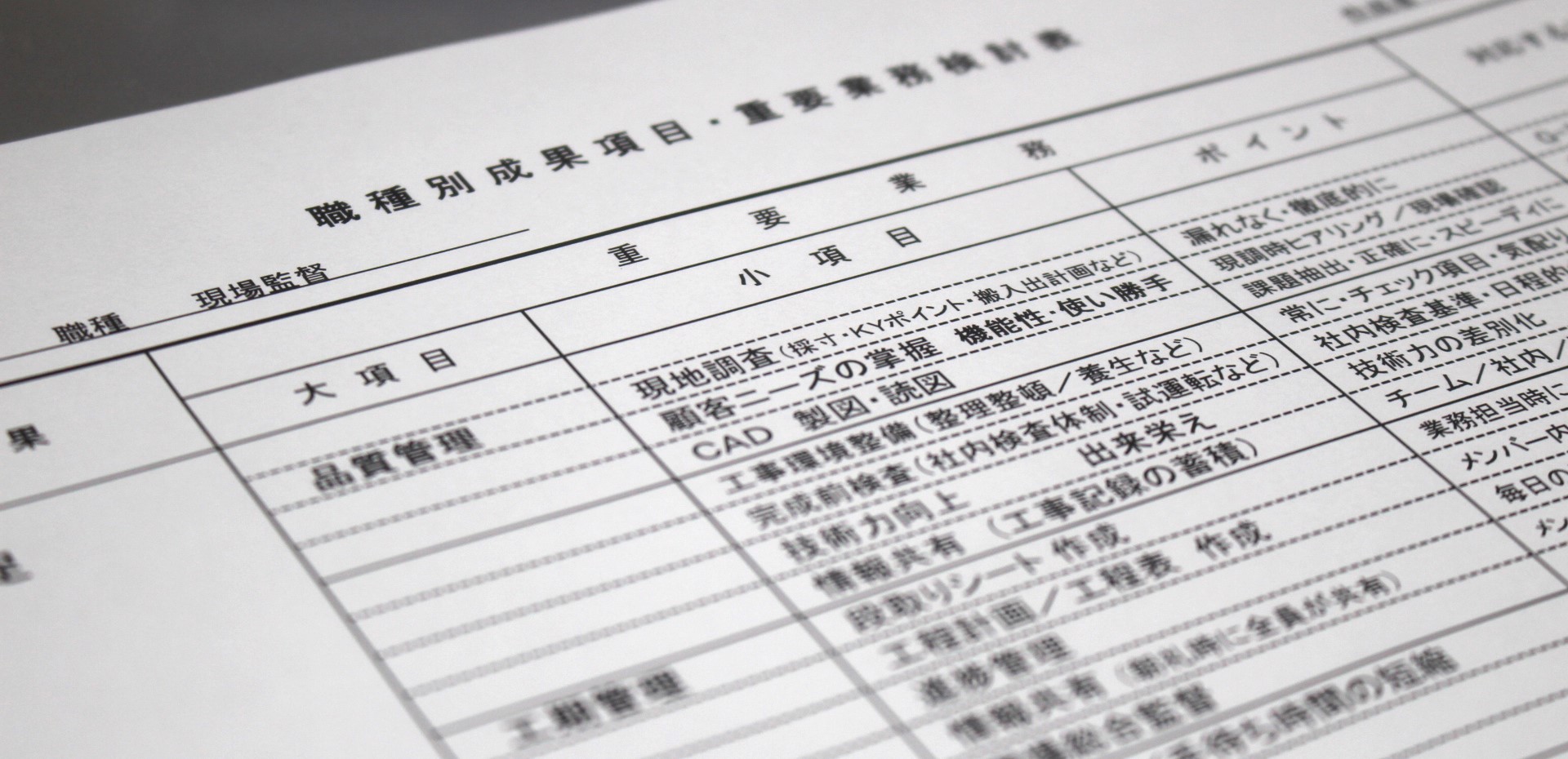 大畠では、人事評価制度を整備するにあたって『現場監督』『現場監督アシスタント』『建設ディレクター』といったそれぞれの職種毎に期待している成果と重要業務を体系的に整理した『職種別成果項目・重要業務検討表』をもとに、仕事の全体像を理解してもらいながら、今やっている仕事が将来に向けての成長にどう役立っているか関連づけて仕事に取り組んでもらっています。