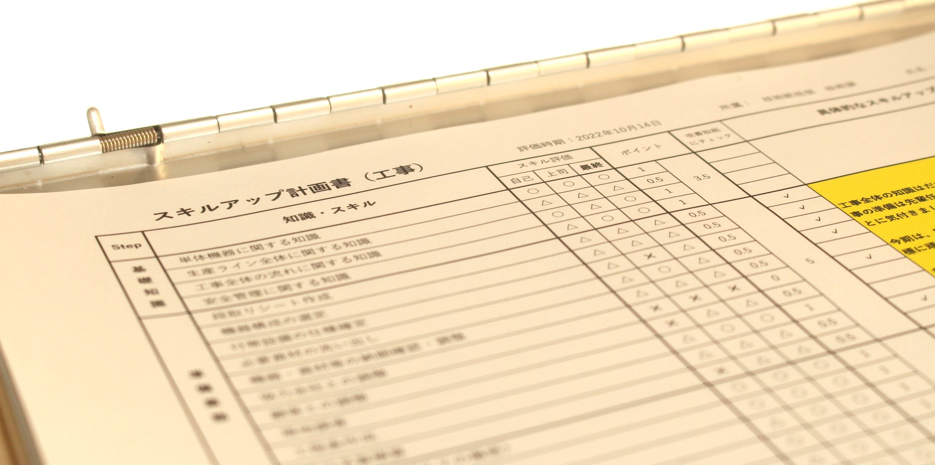 「現場監督アシスタント」として現場デビューする前段階で、業務遂行に必要なスキルを洗い出したスキルの一覧表を提示し、スキル習得に関して心構えを持ってもらうところから仕事は始まっていきます。