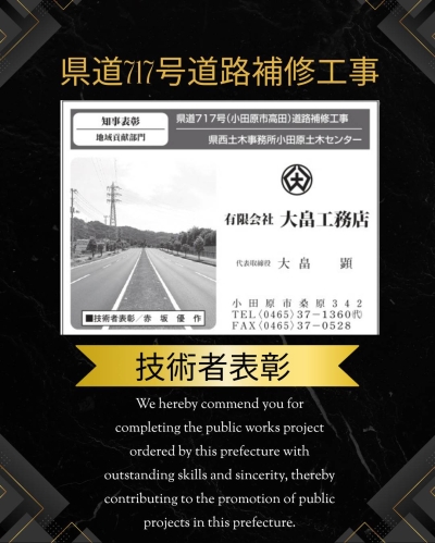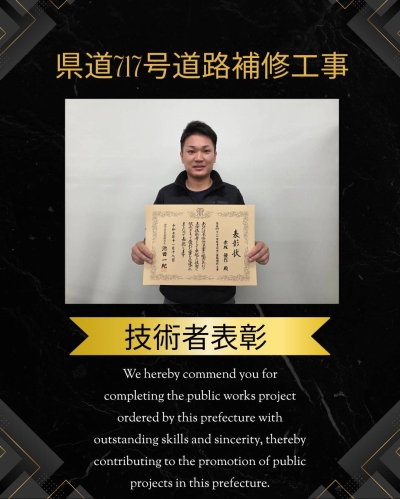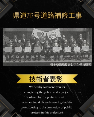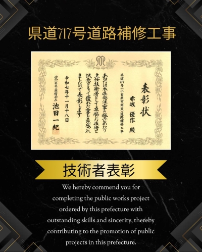 お知らせ 神奈川県県土整備局 技術者表彰 2025.12.24 Tweet 先日の知事表彰に続いて、 神奈川県県土整備局より技術者表彰をいただきました。 前年度に完成した県道717号の道路補修工事で優秀な工事を担当した主任技術者として表彰されました???????? Category:スタッフブログ Author:owner /blog/blog_comments/captcha/60317349 /blog/blog_comments/get_token ≪ 令和7年度神奈川県環境農政局優良工事等局長表彰! ♪事務員の現場見学♪ ≫